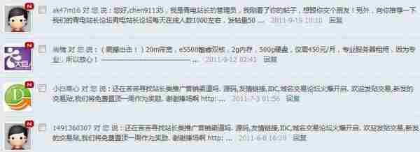 的确,这样其实也是一种很好的描述自身的方式,因为在一个论坛之中,我们往往需要推销自己,我们需要做自己的业务,记得以前知道蓝冰互联的时候,也是通过论坛看到他们的帖子,然后知道他们的网站,最后再去看一下他们的评价,最终确认了他们的服务还不错的观点,其实很多时候,一条短消息是一个营销的门道,在很多时候,我们都会想到那些硬推广,却不屑于使用这些小的推广模式;其实如果一个论坛可以保证相关性的话,这样一点可以很值得让我们用到,而且在个人空间里留言,也是一种外链的制作方式,如图