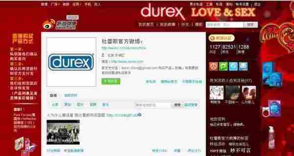 这是杜蕾斯的新浪官方微博。他们巧妙的利用了微博 的背景做了自己产品的推广。整张背景图片都是可以自己处理的,其中背景中间会被微博内容的那宽800px的正文块挡住。除去那800px的宽,其余的地方都可以让我 们做推广。除了做推广外,我们还可以利用它来做营销。比如你有10万粉丝的新浪微博,我们就可以利用背景给商家做广告,打上他们的网址,或者投放一些产品 图片等。然后商量是按月或者按星期收取广告费用。这其中的广告费用虽然没有比微博内容广告来得多,但长期做下去也是一笔不小的财富。如果有10万粉丝的话,一天有2000粉丝来观看你的微博网页是没有问题的。这样用户就可以很直观的看到你的微博背景,一般用户浏览网页最会注意的地方就是在左上角的那一块,因为那块通常 被用来放LOGO。所以这块放一个网站的名称还有网址那么它被注意到的机率是相当大的!