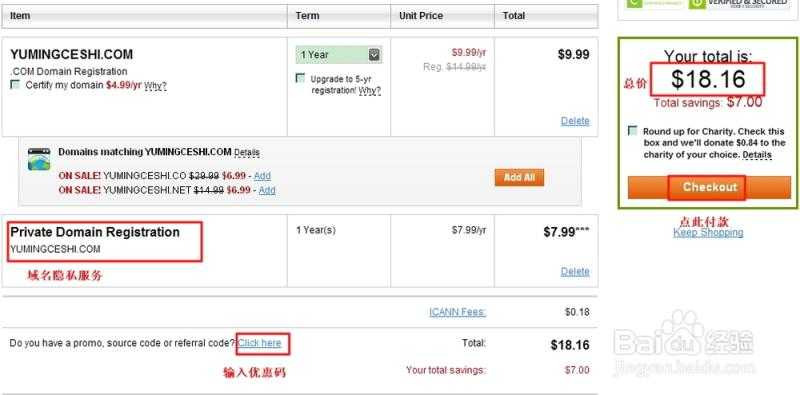 1、将域名加入购物车之后,我们可以看到如下图所示,在域名的下方有个”private”,点击选中”private”前面的单选框就可以了。