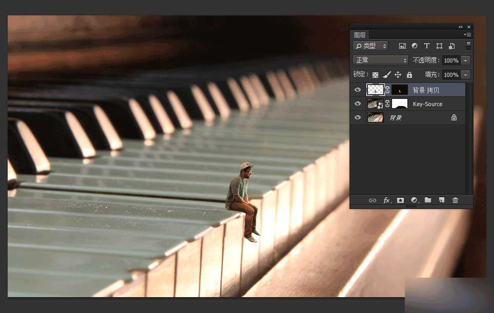 画笔把应该给琴键遮挡的部位擦去,现在人物是坐在琴键上的。