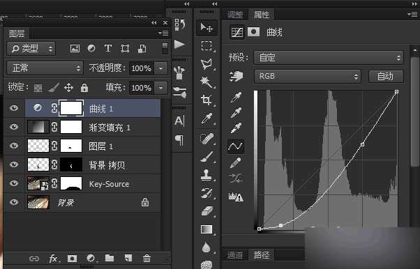 看曲线调整层的蒙版,相信你们懂得怎么做了,就是用画笔把中间擦亮,目的就是为了压暗四周。