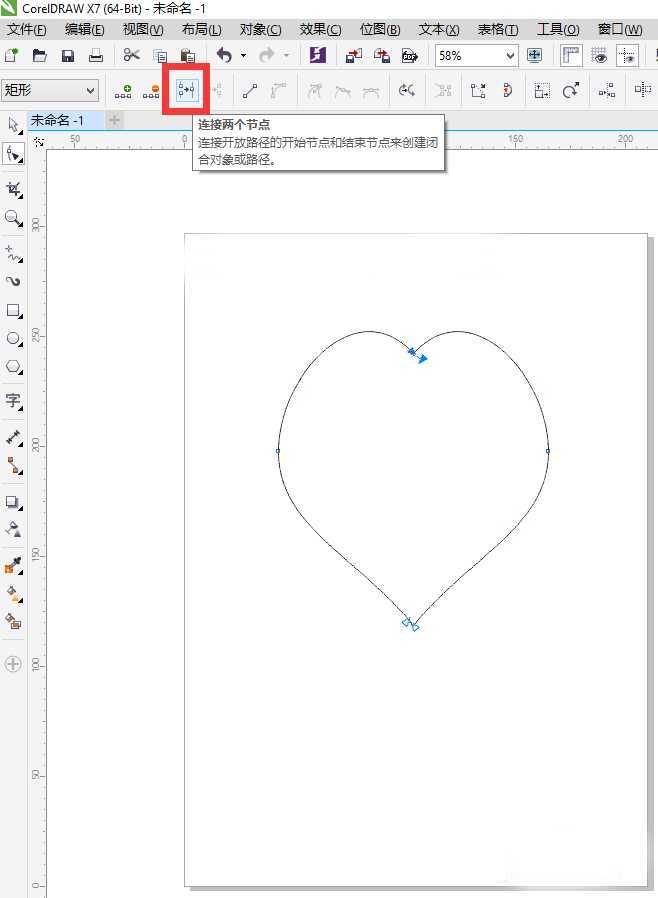 5、选中所有图形,选择属性栏中的合并;合并后,在选择工具箱中的形状工具,选中节点,点击属性栏中的连接两个节点。连接后填充颜色,左键单击右边的颜色填充红色,右键单击右边的颜色描边黄色。