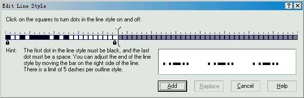在该对话框中拖动滑块到适当的位置,可以控制虚、实线之间的距离;在需要呈现实心点的位置单击鼠标即可显示该点,再次单击即可清除该点。在右下方的预览窗口中显示了编辑后的虚线样式,单击 Add(添加)按钮即可将编辑好的虚线样式添加到Style(样式)列选栏中。