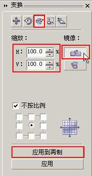 6.在"比例"设置框的"缩放"设置中分别设置H和V都为70%,勾选"不按比例",而圆心位于九格中心,再单击"应用到再制"。意思是将所选对象缩小70%并以对象中心为主复制一份,然后再右边调色板中左键单击黄色,将这个小圆填充为黄色。