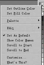在幕屏右边的色彩样式库的最上方,新增了一个色库菜单,利用它,您可以进行集合轮廓线颜色、集合填充颜色、打开其它色彩库、新建色彩库、改变色彩显示模式等操作。这样,在coreldraw10中,您再也不必回到主菜单中就能进行操作了。菜单如图3。