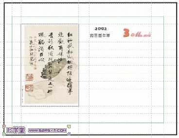 8.下面要进行日历文本的制作了。同样也要大致规划一下,关于日历中星期,阳历和阴历等文本的位置和排版, 然后再进行制作。结合2002年3月实际的日期和星期,先设置辅助线以基本定位上述文本之位置,可参见图1。