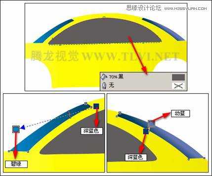 (4)使用“贝塞尔”工具,参照图5-163所示绘制车轮内侧图形,并将其填充为黑色,接着调整车轮图形的顺序到黄色汽车轮廓图形的下面。然后在车顶部再绘制暗部图形,接着为其填充渐变色,完毕后再调整其顺序到后车窗图形下面,如图5-164所示。