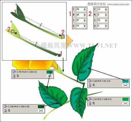 (6)再次使用“贝塞尔”工具在视图相应位置绘制叶子和叶茎轮廓图形,并分别为其填充颜色,效果如图2-9所示。