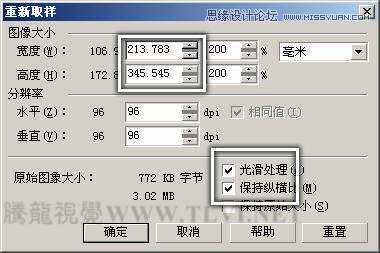 (3)接着执行“位图”→“重取样”命令,打开“重新取样”对话框,参照图1-6所示设置参数,完毕后单击“确定”按钮,重取样位图。