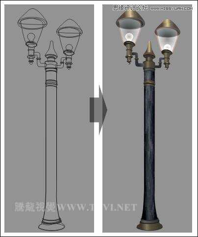 (15)接下来制作路灯。首先参照图3-67所示绘制路灯的轮廓图形,然后再分别对其填充颜色。读者也可以将本书附带光盘\Chapter-03\“路灯.cdr”文件导入到文档中使用。