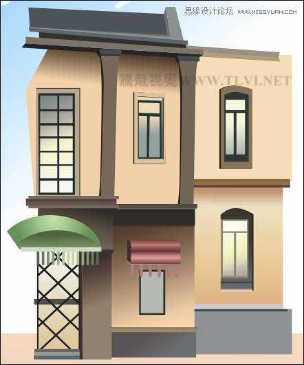提示:通过巧妙的对墙面图形填充渐变色,绘制出受房檐图形阴影影响的墙面效果。使墙面图形更为生动,。