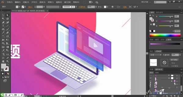7、最后,我们用紫红色的渐变填充最上方的平板,再用半透明的天蓝色填充平板上方的长方形,侧面的路径使用蓝紫色的渐变填充,完成科技网页设计。