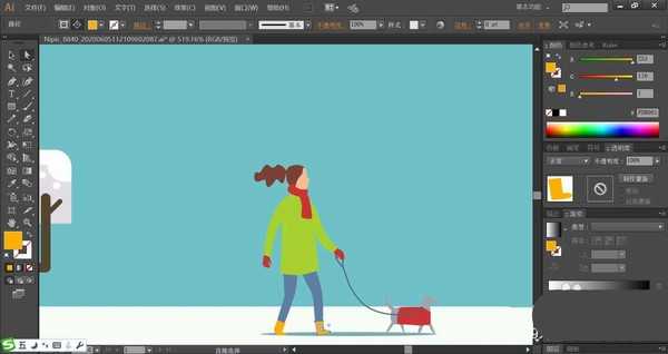4、房子右侧的女子使用绿色填充上衣,再用蓝灰色填充长裤,使用酒红色填充围巾与手套,再用红棕色填充头发,鞋子使用橙黄色填充,脸部使用粉色填充。