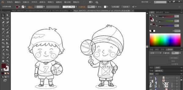1、使用钢笔画出左侧男生的拿球动作路径,再把他的球服也绘制出细节路径,接着,我们绘制出右侧男生的转球动作,绘制出他的服饰与表情路径。