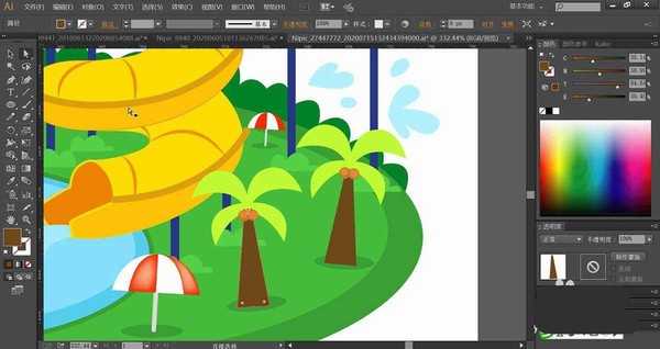 3、使用暗棕色填充椰子树,再用草绿色填充树叶,使用黄褐色填充椰子的路径。使用暗绿色填充树在地面的阴影。