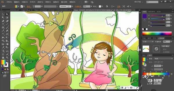 1、使用钢笔画出森林中的树木、藤蔓、草地等元素,再画出秋千与小女孩的细节路径,接着,我们画出远处的小屋、楼房、小河与彩虹等场景元素的路径。