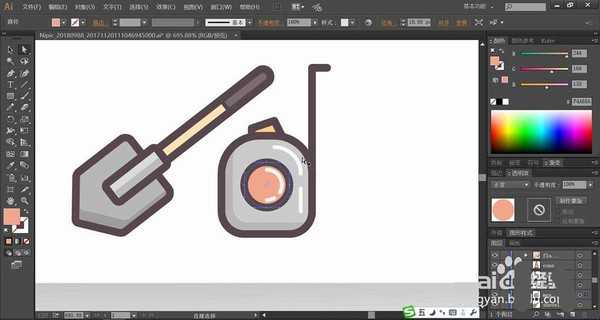 5、使用灰白色填充铲子的主体,再用正片叠底的灰白色填充边缘的暗光路径,使用沙黄色与深灰色填充手柄的内部。铲子的外边框使用灰黑色填充。