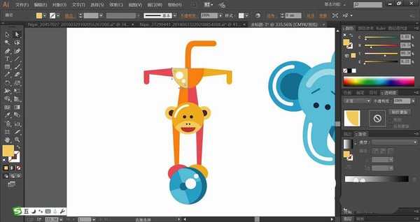4、接着,我们用钢笔工具画出大象的身体动作轮廓,再用圆形画出大象脚下的车轮细节路径。