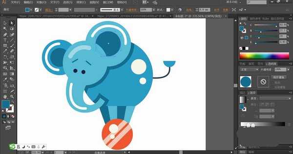 5、使用天蓝色、纯蓝色、深蓝色搭配填充大象的耳朵与身体的结构路径,再用白色填充大象身体上面的高光圆形路径。大象脚下的车轮使用火红色与白色搭配填充,中间使用半透明的白色来进行色彩的过渡。