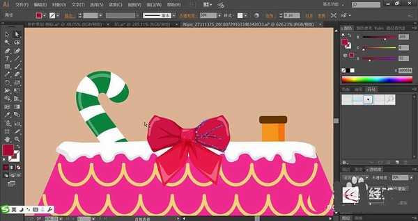 2、使用绿色与白色搭配填充魔法拐杖的路径,再用暗红色与酒红色搭配填充蝴蝶结,使用红棕色与暗橙色填充烟筒的路径。