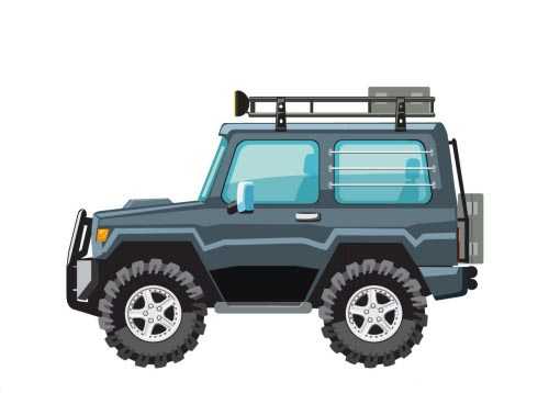 车架的右后侧使用明暗蓝灰色与黑绿色搭配填充车体的凸出结构件,再用橙色与黄色填充前车灯,车体左侧的防撞架使用黑色、灰白色、绿褐色搭配填充,完成越野车图片设计。