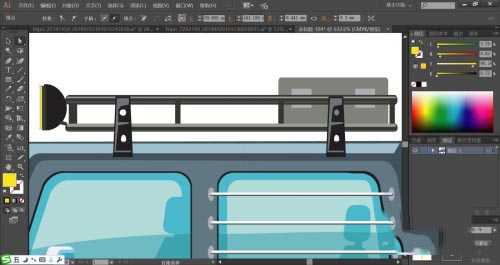 车顶的货架使用蓝灰色与灰黑色、白色搭配填充不同的结构件,高光使用蓝灰色填充,车顶的车灯使用黄色与黑色搭配填充左侧与右侧的结构件。