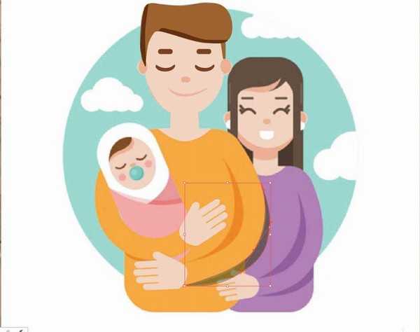 4、这一步,我们画出男子手中的宝宝的身体细节路径,再用粉红色与白色填充衣服,使用粉色与红棕色填充脸蛋与头发,再用明暗绿灰色填充奶嘴的路径。