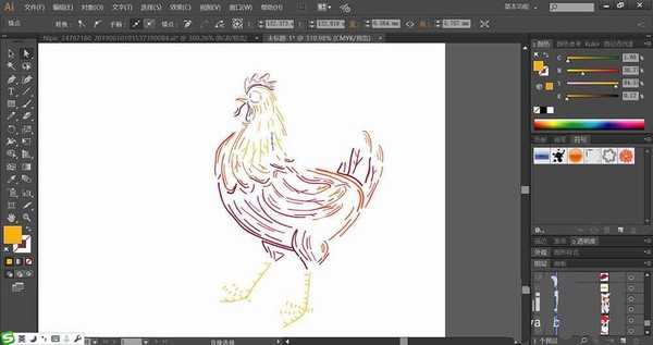 2、使用橙色、桔红色、暗红色、黄色分别填充公鸡身体表面的线条路径,通过过渡色让公鸡身体表面的色彩层次更加的丰富。