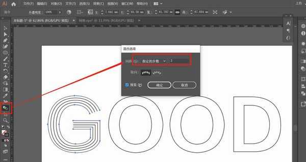 6、混合图形:选择混合工具,设置指定步数,确定,分别G文字上的2条分开的描边上点击,效果如图