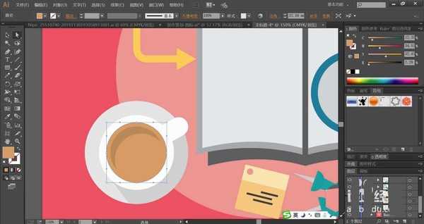 8、最后,我们使用灰白色与白色填充盆子与咖啡杯,再用黄棕色与灰棕色搭配填充咖啡,盆子上面的阴影使用透明度为20%左右的黑色填充,完成搜索研究图片设计。