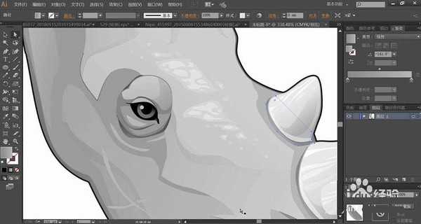 6、犀牛的大角的填色方法与小角一样,在大角的下方用两种明度的灰色渐变进行搭配填充色彩的过渡,犀牛的头部用不同明度的灰白色渐变进行填充形成色彩的变化与层次效果。
