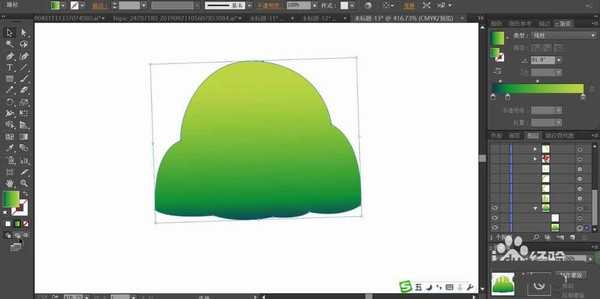 1、先用钢笔画出小屋的尖塔形状再用绿色的渐变填充,上面亮些,下面暗一些。