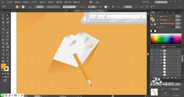 6、继续使用不同明度的橙黄色与淡粉色搭配填充铅笔的主体与笔尖,再用黑色填充笔头。便签用灰白色填充,上面的别针用红、绿、黄三色填充。