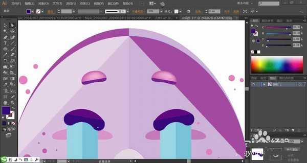 7、最后,我们用紫红色填充脸部上面的大小不同的圆点并使用网格工具做出紫红色渐变效果,再用暗紫红色填充脸颊的左下侧暗光路径,完成流泪表情设计。