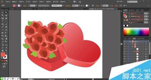 接着,我们用钢笔绘制出盒子内的花朵的路径,分别使用暗红色、红褐色、大红色填充花朵的内部、中间、外部轮廓路径。
