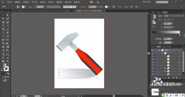 7、最后,我们用圆形画出整个铁锤在地面的椭圆形阴影,设置透明度为40%,用半透明的灰黑色填充,完成铁锤图片设计。
