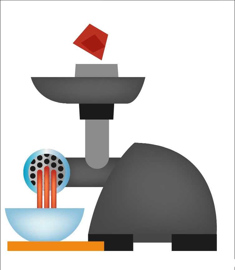 5、接着,使用网格工具点击面碗让其呈现天蓝色渐变效果,我们用天蓝色、黑色、灰色、红色分别填充面条机的出口结构件,让金属材质呈现在出口结构件上。