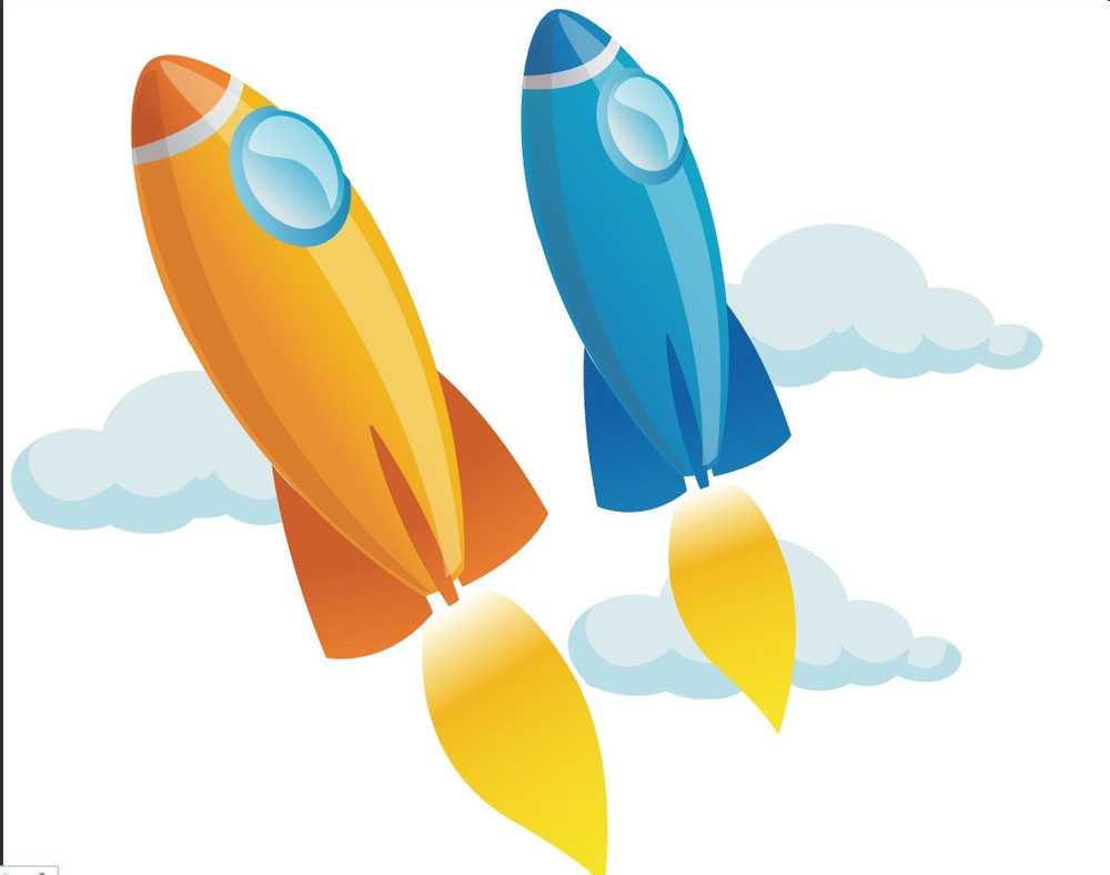 6、我们继续用同样的方法绘制左侧的橙色的火箭,火箭的主体用多种不同明度的橙色渐变填充,其它的元素与蓝色火箭一样。