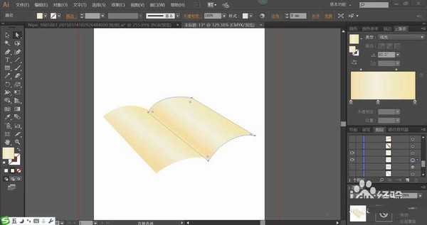 2、接着,我们用沙黄色的渐变分别填充书本的左侧与右侧的路径。书本的中间用透明度为20%的暗橙色渐变填充。