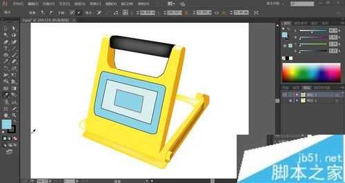 最后,我们用天蓝色与灰白色搭配填充发光区域的细节结构,接着,我们用网格工具点击一下手柄的左右侧做出黑色的渐变,点击一下工作灯的正面下方与顶端让其呈现黄色的渐变,完成工作灯产品设计。