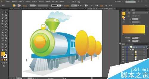 最后,我们在火车头上用橙黄色的渐变填充车头灯,再用橙黄色的渐变填充火车右侧的树木,树木暗光区域用半透明的橙色填充,树干用黄褐色的渐变填充,火车车身的阴影用半透明的蓝色与黑色分别填充,完成火车图片设计。