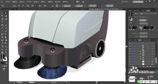 6、我们用灰黑色的渐变填充扫地机前面下方的圆柱形结构件,再用半透明的灰黑色渐变填充清洁球上面的毛刷,车轮用灰白色的渐变与灰黑色的渐变搭配填充。