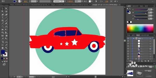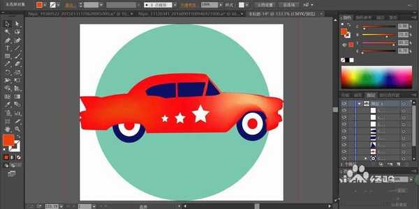 5、我们用红色填充汽车的车身,用蓝色填充汽车的窗户,用白色填充五角星,再用蓝白红三色填充轮胎,完成汽车图标设计。