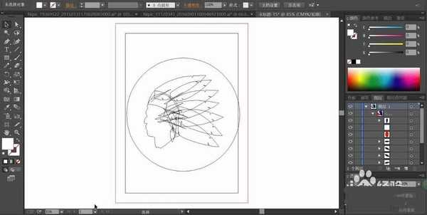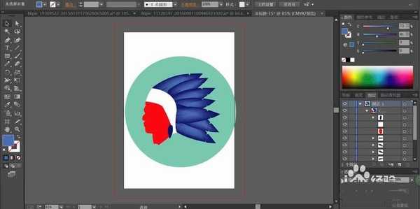 7、最后,我们用钢笔工具画出印第安人的头饰羽毛路径,侧脸与头带的路径,我们用蓝红白三色填充各个元素,再用网格工具让羽毛的发光效果呈现出来,完成所有美国元素图标设计。