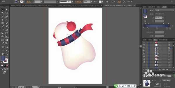 3、使用钢笔画出雪人的围巾,再用暗红色的渐变填充,接着,我们画出围巾上面的条纹并用蓝黑色的渐变填充。