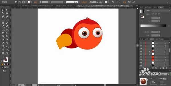 3、使用圆形工具画出鸟的眼晴并用桔红色填充底部,复制缩小这个圆形并用灰白色的渐变填充作为眼白,再用小的圆形填充灰棕色的渐变作为瞳孔,再用白色填充眼晴上小的圆形高光区域。另外一只眼晴也用同样的方法绘制出来。