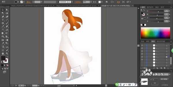 5、用淡桃色填充女孩的高跟鞋的路径,再用桃红色填充长裙在左侧的暗光区域。