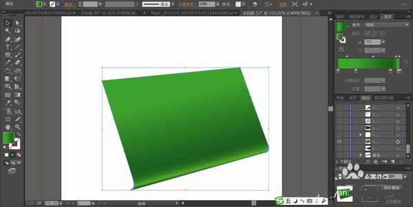2、设置绿色的渐变填充台历的正面轮廓,让高光出现在上方区域,暗光在下方,底部设置一个高光的平行线让立体效果呈现出来。渐变的角度在75%左右。