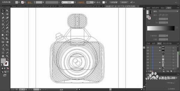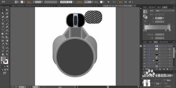 4、这一步,我们用灰黑色的渐变填充灯头前方的网格结构路径,再移动到灯头上方,在灯头的下方用灰黑色填充相机的快门结构,让快门结构件呈现在相机的中间左上方位置。