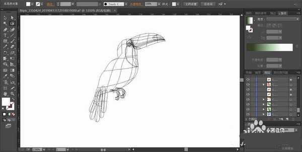 6、最后,我们使用网格工具应用之前的填色方法绘制出大嘴鸟的尾巴,再用灰黑色与灰黑色填充鸟的腿,完成大嘴鸟图片设计。
